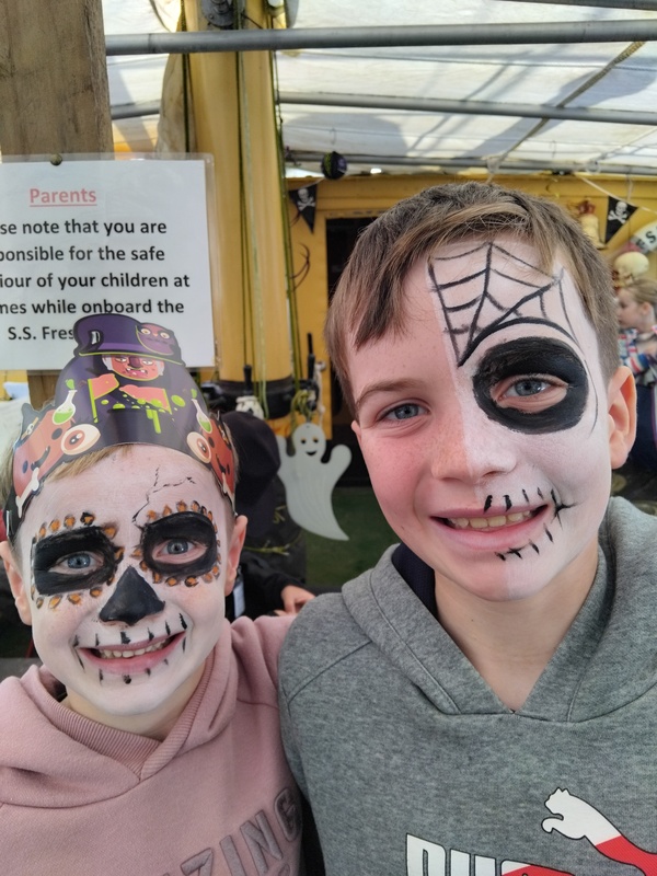 One of the busiest spots on the ship was Nadine’s face painting, where queues of excited youngsters waited patiently to be transformed into witches, ghosts, and ghouls. The band added to the festive spirit with lively music and sing-alongs, helped by a brilliant sound system and Halloween playlist kindly provided by our newest supporter, Paul Bevan.